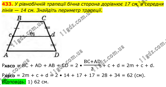 У рівнобічній трапеції бічна сторона дорівнює 17 см, а середня лінія — 14 см. Знайдіть периметр трапеції. PABCD = BC + AD + AB + CD = 2 • (BC+AD)/2 + c + d = 2m + c + d. PABCD = 2m + c + d = 2 • 14 + 17 + 17 = 28 + 34 = 62 (см). Відповідь: 1) 62 см.