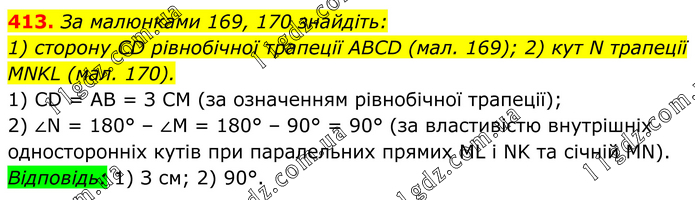 За малюнками 169, 170 знайдіть: 1) сторону CD рівнобічної трапеції ABCD (мал. 169); 2) кут N трапеції MNKL (мал. 170). 1) CD = AB = З CM (за означенням рівнобічної трапеції); 2) ∠N = 180° – ∠M = 180° – 90° = 90° (за властивістю внутрішніх односторонніх кутів при паралельних прямих ML і NK та січній MN). Відповідь: 1) З см; 2) 90°.