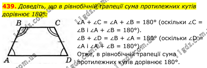 Доведіть, що в рівнобічній трапеції сума протилежних кутів дорівнює 180°. ∠A + ∠C = ∠A + ∠B = 180° (оскільки ∠C = ∠B і ∠A + ∠B = 180°). ∠B + ∠D = ∠B + ∠A = 180° (оскільки ∠D = ∠A i ∠A + ∠B = 180°). Отже, в рівнобічній трапеції сума протилежних кутів дорівнює 180°.