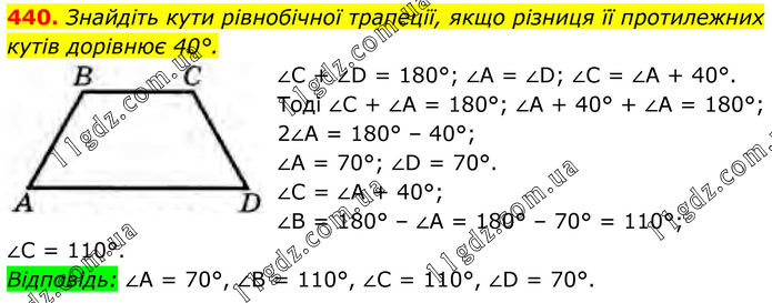 Знайдіть кути рівнобічної трапеції, якщо різниця її протилежних кутів дорівнює 40°. ∠С + ∠D = 180°; ∠A = ∠D; ∠C = ∠A + 40°. Тоді ∠С + ∠А = 180°; ∠A + 40° + ∠А = 180°; 2∠А = 180° – 40°; ∠А = 70°; ∠D = 70°. ∠C = ∠A + 40°; ∠В = 180° – ∠А = 180° – 70° = 110°; ∠С = 110°. Відповідь: ∠А = 70°, ∠В = 110°, ∠C = 110°, ∠D = 70°.