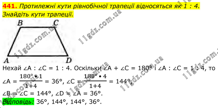 Протилежні кути рівнобічної трапеції відносяться як 1 : 4. Знайдіть кути трапеції. Нехай ∠A : ∠C = 1 : 4. Оскільки ∠A + ∠C = 180° і ∠A : ∠C = 1 : 4, тo ∠A = (180° • 1)/(1+4) = 36°, ∠C = (180° • 4)/(1+4) = 144°, ∠B = ∠C = 144°, ∠D = ∠A = 36°. Відповідь: 36°, 144°, 144°, 36°.