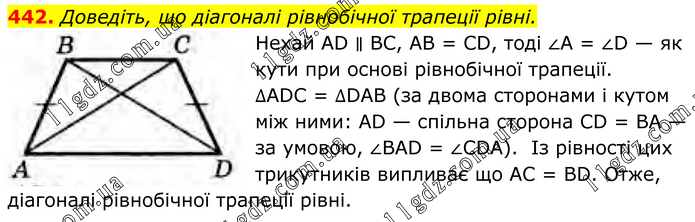 Доведіть, що діагоналі рівнобічної трапеції рівні. Нехай AD ∥ BC, AB = CD, тоді ∠A = ∠D — як кути при основі рівнобічної трапеції. ∆ADC = ∆DAB (за двома сторонами і кутом між ними: AD — спільна сторона CD = ВА — за умовою, ∠BAD = ∠CDA). Із рівності цих трикутників випливає що АС = BD. Отже, діагоналі рівнобічної трапеції рівні.
