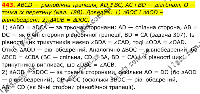 ABCD — рівнобічна трапеція, AD ∥ BC, AC і BD — діагоналі, О —точка їх перетину (мал. 188). Доведіть: 1) ∆BOC і ∆AOD – рівнобедрені; 2) ∆AOB = ∆DOC. 1) ∆ABD = ∆DCA — за трьома сторонами: AD — спільна сторона, AB = DC — як бічні сторони рівнобічної трапеції, BD = СА (задача 307). Із рівності цих трикутників маємо ∠BDA = ∠CAD, тоді ∠ODA = ∠OAD. Отже, ∆AOD — рівнобедрений. Аналогічно ∆BOC — рівнобедрений, бо ∆ВСD = ∆СBА (ВС — спільна, CD = BA, BD = СА) і із рівності цих трикутників випливає, що ∠DBC = ∠ACB. 2) ∆AOB = ∆DOC — за трьома сторонами, оскільки AО = DO (бо ∆AOD — рівнобедрений), OB = ОС (оскільки ∆ВОС — рівнобедрений, AB = CD (як бічні сторони рівнобічної трапеції).