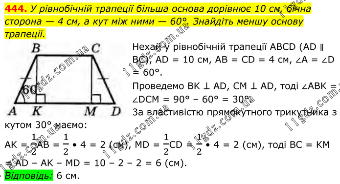 У рівнобічній трапеції більша основа дорівнює 10 см, бічна сторона — 4 см, а кут між ними — 60°. Знайдіть меншу основу трапеції. Нехай у рівнобічній трапеції ABCD (AD ∥ BC), AD = 10 см, АВ = CD = 4 см, ∠A = ∠D = 60°. Проведемо BK ⊥ AD, CM ⊥ AD, тоді ∠ABK = ∠DCM = 90° – 60° = 30°. 3a властивістю прямокутного трикутника з кутом 30° маємо: АK = 1/2AВ = 1/2 • 4 = 2 (cм), MD = 1/2CD = 1/2 • 4 = 2 (cм), тоді BC = KM = AD – AK – MD = 10 – 2 – 2 = 6 (см). Відповідь: 6 см.