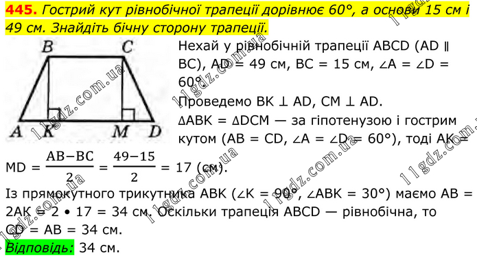 Гострий кут рівнобічної трапеції дорівнює 60°, а основи 15 см і 49 см. Знайдіть бічну сторону трапеції. Нехай у рівнобічній трапеції ABCD (AD ∥ ВС), AD = 49 см, ВС = 15 см, ∠A = ∠D = 60°. Проведемо BK ⊥ AD, CM ⊥ AD. ∆ABK = ∆DCM — за гіпотенузою і гострим кутом (AB = CD, ∠A = ∠D = 60°), тоді AK = MD = (AB-BC)/2 = (49-15)/2 = 17 (cм). Із прямокутного трикутника АВK (∠K = 90°, ∠ABK = 30°) маємо AB = 2АК = 2 • 17 = 34 см. Оскільки трапеція ABCD — рівнобічна, то CD = АВ = 34 см. Відповідь: 34 см.
