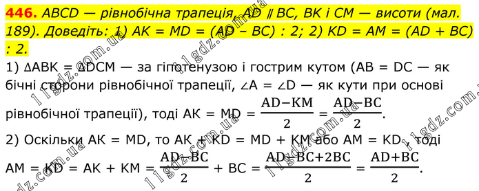 ABCD — рівнобічна трапеція, AD ∥ ВC, BK і CM — висоти (мал. 189). Доведіть: 1) AK = MD = (AD – BC) : 2; 2) KD = AM = (AD + BC) : 2. 1) ∆ABK = ∆DCM — за гіпотенузою і гострим кутом (AB = DC — як бічні сторони рівнобічної трапеції, ∠A = ∠D — як кути при основі рівнобічної трапеції), тоді АК = МD = (AD-KM)/2 = (AD-BC)/2. 2) Оскільки АК = MD, то АК + KD = MD + KM або AM = KD, тоді AM = KD = AK + KM = (AD-BC)/2 + BC = (AD-BC+2BC)/2 = (AD+BC)/2.