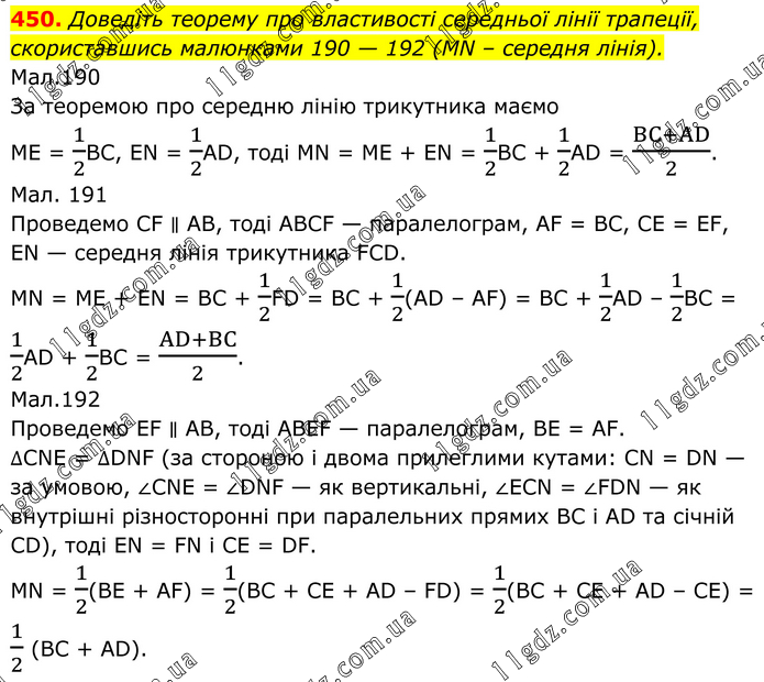 Доведіть теорему про властивості середньої лінії трапеції, скориставшись малюнками 190 — 192 (MN – середня лінія). Мал.190 За теоремою про середню лінію трикутника маємо МЕ = 1/2ВС, EN = 1/2AD, тодi MN = ME + EN = 1/2BC + 1/2AD = (BC+AD)/2. Мал. 191 Проведемо CF ∥ AB, тоді ABCF — паралелограм, AF = ВС, CE = EF, EN — середня лінія трикутника FCD. MN = ME + EN = BC + 1/2FD = BC + 1/2(AD – AF) = BC + 1/2AD – 1/2BC = 1/2AD + 1/2BC = (AD+BC)/2. Мал.192 Проведемо EF ∥ AB, тоді ABEF — паралелограм, BE = AF. ∆CNE = ∆DNF (за стороною і двома прилеглими кутами: CN = DN — за умовою, ∠CNE = ∠DNF — як вертикальні, ∠ECN = ∠FDN — як внутрішні різносторонні при паралельних прямих ВС і AD та січній CD), тоді EN = FN і СЕ = DF. MN = 1/2(ВЕ + AF) = 1/2(BC + CE + AD – FD) = 1/2(BC + CE + AD – CE) = 1/2 (BC + AD).