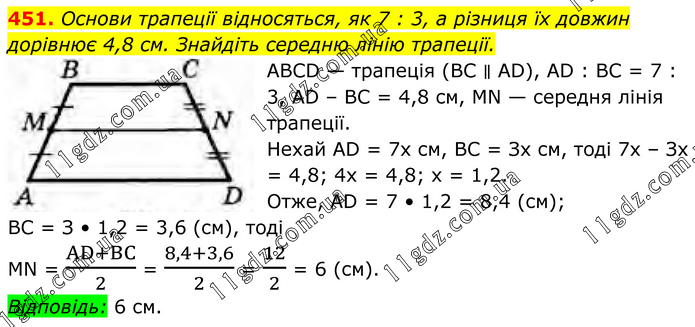 Основи трапеції відносяться, як 7 : 3, а різниця їх довжин дорівнює 4,8 см. Знайдіть середню лінію трапеції. ABCD — трапеція (BC ∥ AD), AD : BC = 7 : 3, AD – BC = 4,8 cм, MN — середня лінія трапеції. Нехай AD = 7x см, ВС = Зх см, тоді 7х – Зх = 4,8; 4x = 4,8; x = 1,2. Отже, AD = 7 • 1,2 = 8,4 (см); ВС = З • 1,2 = 3,6 (см), тоді MN = (AD+BC)/2 = (8,4+3,6)/2 = 12/2 = 6 (см). Відповідь: 6 см.