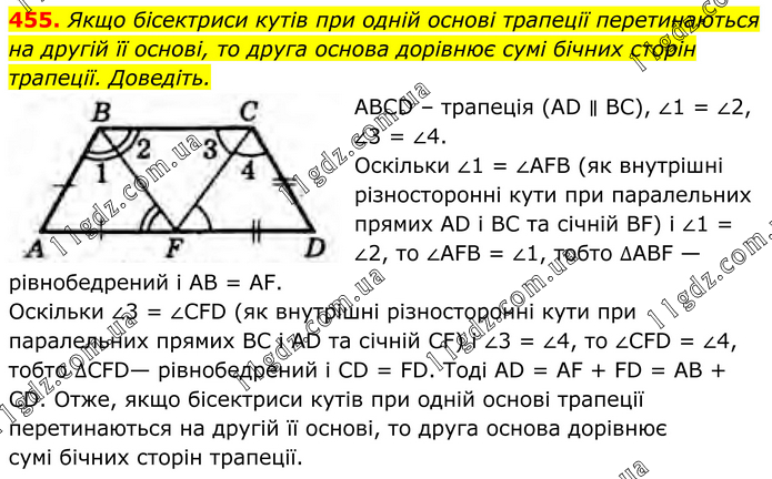 Якщо бісектриси кутів при одній основі трапеції перетинаються на другій її основі, то друга основа дорівнює сумі бічних сторін трапеції. Доведіть. ABCD – трапеція (AD ∥ BC), ∠1 = ∠2, ∠3 = ∠4. Оскільки ∠1 = ∠AFB (як внутрішні різносторонні кути при паралельних прямих AD і ВС та січній BF) і ∠1 = ∠2, то ∠AFB = ∠1, тобто ∆АВF — рівнобедрений і AB = АF. Оскільки ∠3 = ∠CFD (як внутрішні різносторонні кути при паралельних прямих ВС і AD та січній CF) і ∠3 = ∠4, то ∠CFD = ∠4, тобто ∆CFD— рівнобедрений i CD = FD. Toдi AD = AF + FD = AB + CD. Отже, якщо бісектриси кутів при одній основі трапеції перетинаються на другій її основі, то друга основа дорівнює сумі бічних сторін трапеції.