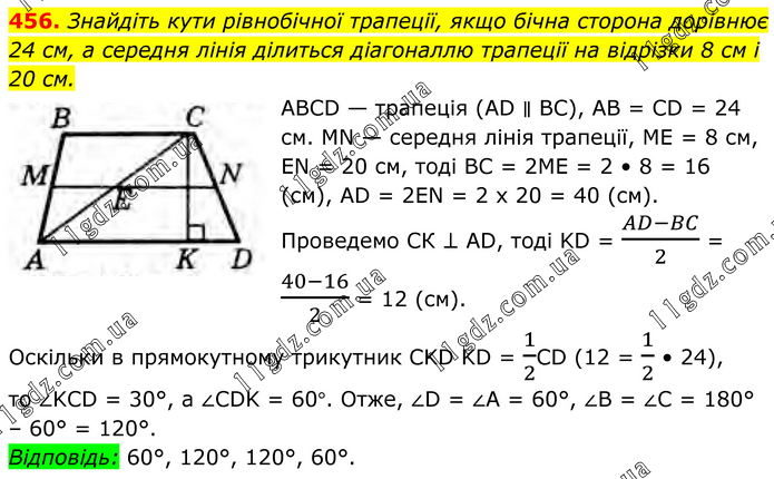 Знайдіть кути рівнобічної трапеції, якщо бічна сторона дорівнює 24 см, а середня лінія ділиться діагоналлю трапеції на відрізки 8 см і 20 см. ABCD — трапеція (AD ∥ ВС), АВ = CD = 24 см. MN — середня лінія трапеції, ME = 8 см, EN = 20 см, тоді ВС = 2МЕ = 2 • 8 = 16 (см), AD = 2EN = 2 х 20 = 40 (см). Проведемо СК ⊥ AD, тоді KD = (AD-BC)/2 = (40-16)/2 = 12 (см). Оскільки в прямокутному трикутник CKD KD = 1/2CD (12 = 1/2 • 24), то ∠KCD = 30°, а ∠CDK = 60°. Отже, ∠D = ∠A = 60°, ∠B = ∠C = 180° – 60° = 120°. Відповідь: 60°, 120°, 120°, 60°.
