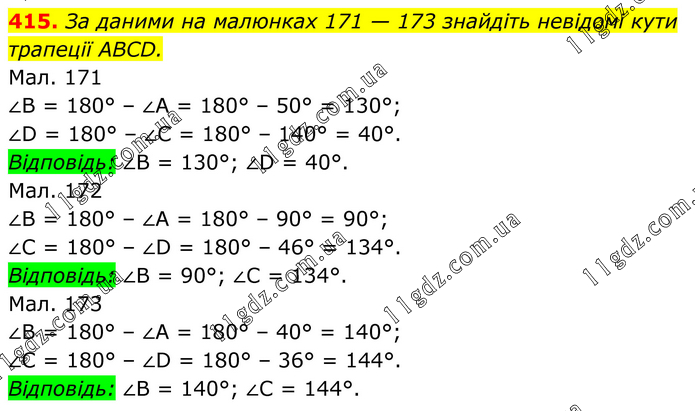 За даними на малюнках 171 — 173 знайдіть невідомі кути трапеції ABCD. Мал. 171 ∠B = 180° – ∠A = 180° – 50° = 130°; ∠D = 180° – ∠C = 180° – 140° = 40°. Відповідь: ∠B = 130°; ∠D = 40°. Мал. 172 ∠B = 180° – ∠A = 180° – 90° = 90°; ∠C = 180° – ∠D = 180° – 46° = 134°. Відповідь: ∠B = 90°; ∠C = 134°. Мал. 173 ∠B = 180° – ∠A = 180° – 40° = 140°; ∠C = 180° – ∠D = 180° – 36° = 144°. Відповідь: ∠B = 140°; ∠C = 144°.