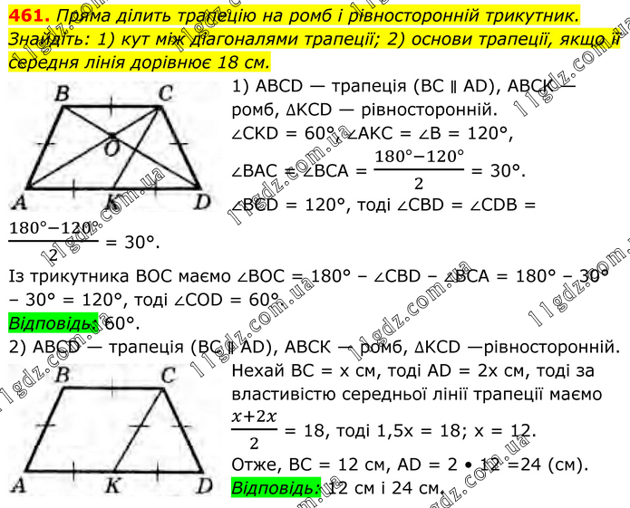 Пряма ділить трапецію на ромб і рівносторонній трикутник. Знайдіть: 1) кут між діагоналями трапеції; 2) основи трапеції, якщо її середня лінія дорівнює 18 см. 1) ABCD — трапеція (ВС ∥ AD), ABCK — ромб, ∆KCD — рівносторонній. ∠CKD = 60°, ∠AKC = ∠B = 120°, ∠BAC = ∠BCA = (180°-120°)/2 = 30°. ∠BCD = 120°, тоді ∠CBD = ∠CDB = (180°-120°)/2 = 30°. Із трикутника ВОС маємо ∠BOC = 180° – ∠CBD – ∠ВСА = 180° – 30° – 30° = 120°, тоді ∠COD = 60°. Відповідь: 60°. 2) ABCD — трапеція (ВС ∥ AD), АВСК — ромб, ∆KCD —рівносторонній. Нехай ВС = х cм, тоді AD = 2х см, тоді за властивістю середньої лінії трапеції маємо (x+2x)/2 = 18, тоді 1,5x = 18; x = 12. Отже, ВС = 12 см, AD = 2 • 12 =24 (см). Відповідь: 12 см і 24 см.