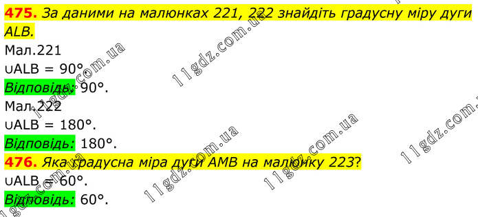 475. За даними на малюнках 221, 222 знайдіть градусну міру дуги ALB. Мал.221 ∪ALB = 90°. Відповідь: 90°. Мал.222 ∪ALB = 180°. Відповідь: 180°. 476. Яка градусна міра дуги AMB на малюнку 223? ∪ALB = 60°. Відповідь: 60°.
