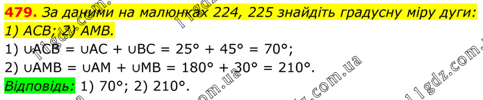За даними на малюнках 224, 225 знайдіть градусну міру дуги: 1) AСB; 2) AMB. 1) ∪ACB = ∪AC + ∪BC = 25° + 45° = 70°; 2) ∪AMB = ∪AM + ∪MB = 180° + 30° = 210°. Відповідь: 1) 70°; 2) 210°.