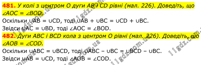481. У колі з центром O дуги AB і CD рівні (мал. 226). Доведіть, що ∠AOC = ∠BOD. Оскільки ∪AB = ∪CD, тоді ∪AB + ∪ВС = ∪CD + ∪ВС. Звідси ∪AC = ∪BD, тоді ∠AOC = ∠BOD. 482. Дуги ABC і BCD кола з центром O рівні (мал. 226). Доведіть, що ∠AOB = ∠COD. Оскільки ∪ABC = ∪BCD, тоді ∪ABC – ∪BC = ∪BCD – ∪BC. Звідси ∪AB = ∪CD, тоді ∠AOB = ∠COD.