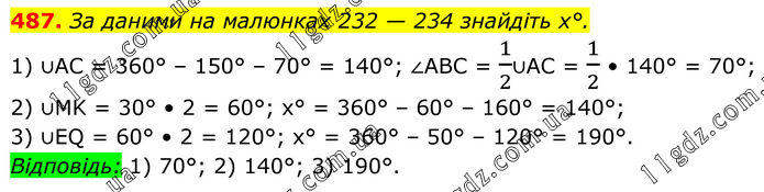 За даними на малюнках 232 — 234 знайдіть х°. 1) ∪AC = 360° – 150° – 70° = 140°; ∠ABC = 1/2∪AC = 1/2 • 140° = 70°; 2) ∪MK = 30° • 2 = 60°; x° = 360° – 60° – 160° = 140°; 3) ∪EQ = 60° • 2 = 120°; x° = 360° – 50° – 120° = 190°. Відповідь: 1) 70°; 2) 140°; 3) 190°.