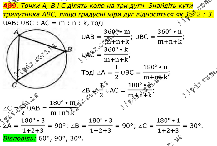 Точки А, В і С ділять коло на три дуги. Знайдіть кути трикутника ABC, якщо градусні міри дуг відносяться як 1 : 2 : 3. ∪AB; ∪BC : AC = m : n : k, тоді ∪AB = (360° • m)/(m+n+k); ∪BC = (360° • n)/(m+n+k); ∪AC = (360° • k)/(m+n+k); Тоді ∠А = 1/2 ∪BC = (180° • n)/(m+n+k); ∠B = 1/2 ∪AC = (180° • k)/(m+n+k); ∠C = 1/2 ∪AB = (180° • m)/(m+n+k). ∠А = (180° • 3)/(1+2+3) = 90°; ∠B = (180° • 3)/(1+2+3) = 90°; ∠C = (180° • 1)/(1+2+3) = 30°. Відповідь: 60°, 90°, 30°.
