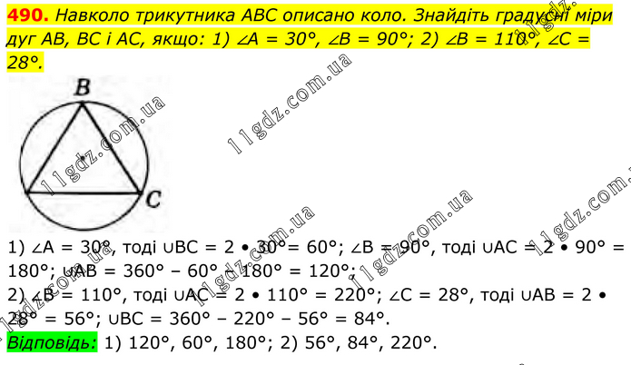 Навколо трикутника ABC описано коло. Знайдіть градусні міри дуг AB, BC і AC, якщо: 1) ∠A = 30°, ∠B = 90°; 2) ∠B = 110°, ∠C = 28°. 1) ∠A = 30°, тоді ∪BC = 2 • 30°= 60°; ∠B = 90°, тоді ∪AC = 2 • 90° = 180°; ∪AB = 360° – 60° – 180° = 120°; 2) ∠B = 110°, тоді ∪AC = 2 • 110° = 220°; ∠C = 28°, тоді ∪AB = 2 • 28° = 56°; ∪BC = 360° – 220° – 56° = 84°. Відповідь: 1) 120°, 60°, 180°; 2) 56°, 84°, 220°.