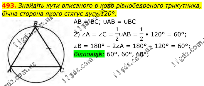 Знайдіть кути вписаного в коло рівнобедреного трикутника, бічна сторона якого стягує дугу 120°. AB = BC; ∪AB = ∪BC 2) ∠A = ∠C = 1/2∪AB = 1/2 • 120° = 60°; ∠B = 180° – 2∠A = 180° – 120° = 60°; Відповідь: 60°, 60°, 60°;