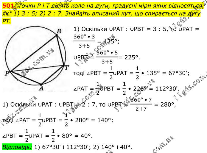 501. Точки P і T ділять коло на дуги, градусні міри яких відносяться, як: 1) 3 : 5; 2) 2 : 7. Знайдіть вписаний кут, що спирається на дугу PT. 1) Оскільки ∪РAT : ∪РВТ = З : 5, то ∪РAТ = (360° • 3)/(3+5) = 135°; ∪РBТ = (360° • 5)/(3+5)= 225°. Тоді ∠РВT = 1/2∪РAT = 1/2 • 135° = 67°30'; ∠PAT = 1/2∪РВT = 1/2 • 225° = 112°30'. 1) Оскільки ∪РAT : ∪РВТ = 2 : 7, то ∪РBТ = (360° • 7)/(2+7) = 280°, тоді ∠РАT = 1/2∪РBT = 1/2 • 280° = 140°; ∠PBT = 1/2∪РAT = 1/2 • 80° = 40°. Відповідь: 1) 67°30' і 112°30'; 2) 140° і 40°.