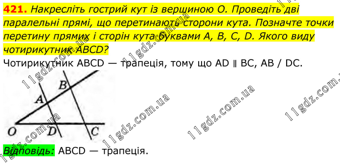 Накресліть гострий кут із вершиною О. Проведіть дві паралельні прямі, що перетинають сторони кута. Позначте точки перетину прямих і сторін кута буквами А, В, С, D. Якого виду чотирикутник ABCD? Чотирикутник ABCD — трапеція, тому що AD ∥ ВС, АВ / DC. Відповідь: ABCD — трапеція.