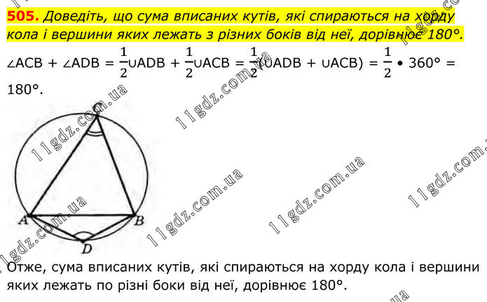 505. Доведіть, що сума вписаних кутів, які спираються на хорду кола і вершини яких лежать з різних боків від неї, дорівнює 180°. ∠ACB + ∠ADB = 1/2∪ADB + 1/2∪ACB = 1/2(∪ADB + ∪ACB) = 1/2 • 360° = 180°. Отже, сума вписаних кутів, які спираються на хорду кола і вершини яких лежать по різні боки від неї, дорівнює 180°.