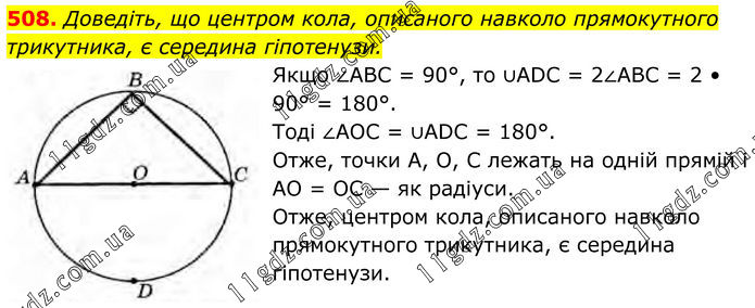 508. Доведіть, що центром кола, описаного навколо прямокутного трикутника, є середина гіпотенузи. Якщо ∠ABC = 90°, то ∪ADC = 2∠АВС = 2 • 90° = 180°. Тоді ∠AOC = ∪ADС = 180°. Отже, точки А, О, С лежать на одній прямій і АО = ОС — як радіуси. Отже, центром кола, описаного навколо прямокутного трикутника, є середина гіпотенузи.
