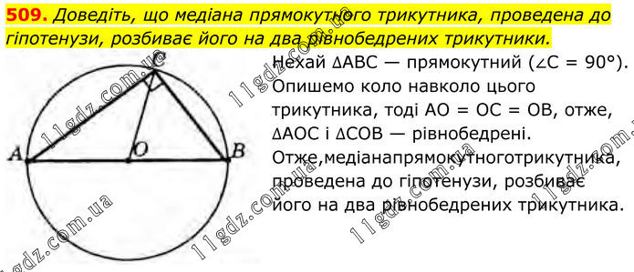 509. Доведіть, що медіана прямокутного трикутника, проведена до гіпотенузи, розбиває його на два рівнобедрених трикутники. Нехай ∆АВС — прямокутний (∠C = 90°). Опишемо коло навколо цього трикутника, тоді АО = ОС = ОВ, отже, ∆АОС і ∆СОВ — рівнобедрені. Отже,медіанапрямокутноготрикутника, проведена до гіпотенузи, розбиває його на два рівнобедрених трикутника.