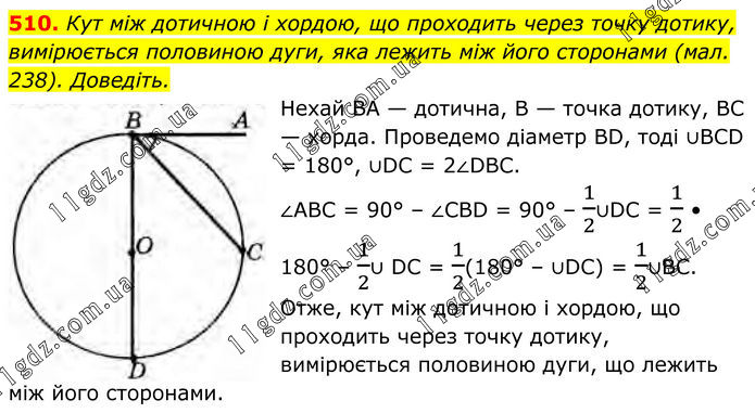510. Кут між дотичною і хордою, що проходить через точку дотику, вимірюється половиною дуги, яка лежить між його сторонами (мал. 238). Доведіть. Нехай BА — дотична, В — точка дотику, ВС — хорда. Проведемо діаметр BD, тоді ∪BCD = 180°, ∪DC = 2∠DBC. ∠ABC = 90° – ∠CBD = 90° – 1/2∪DC = 1/2 • 180° – 1/2∪ DC = 1/2(180° – ∪DC) = 1/2∪BC. Отже, кут між дотичною і хордою, що проходить через точку дотику, вимірюється половиною дуги, що лежить між його сторонами.