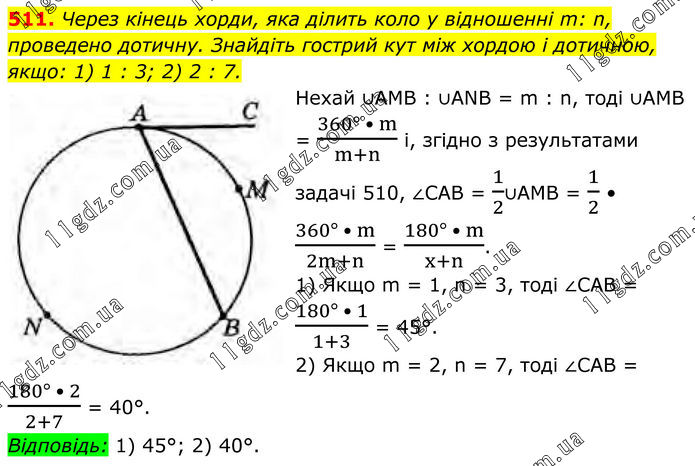 511. Через кінець хорди, яка ділить коло у відношенні m: n, проведено дотичну. Знайдіть гострий кут між xордою і дотичною, якщо: 1) 1 : 3; 2) 2 : 7. Нехай ∪AMB : ∪ANB = m : n, тоді ∪AMB = (360° • m)/(m+n) i, згідно з результатами задачі 510, ∠CAB = 1/2∪AMB = 1/2 • (360° • m)/(2m+n) = (180° • m)/(x+n). 1) Якщо m = 1, n = 3, тоді ∠CAB = (180° • 1)/(1+3) = 45°. 2) Якщо m = 2, n = 7, тоді ∠CAB = (180° • 2)/(2+7) = 40°. Відповідь: 1) 45°; 2) 40°.