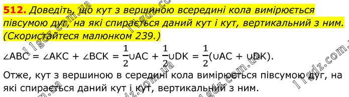 512. Доведіть, що кут з вершиною всередині кола вимірюється півсумою дуг, на які спирається даний кут і кут, вертикальний з ним. (Скористайтеся малюнком 239.) ∠ABC = ∠AKC + ∠BCK = 1/2∪AC + 1/2∪DK = 1/2(∪AC + ∪DK). Отже, кут з вершиною в середині кола вимірюється півсумою дуг, на які спирається даний кут і кут, вертикальний з ним.