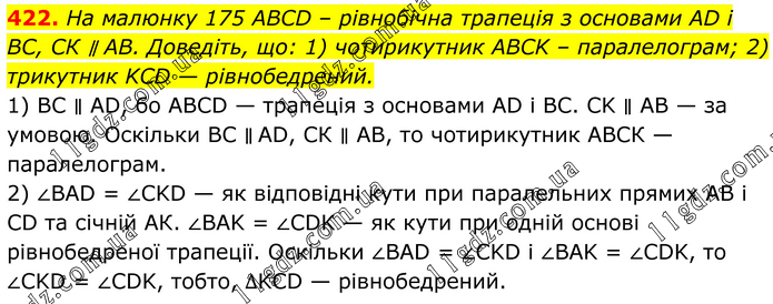 На малюнку 175 ABCD – рівнобічна трапеція з основами AD і BC, СК ∥ АВ. Доведіть, що: 1) чотирикутник ABCK – паралелограм; 2) трикутник KCD — рівнобедрений. 1) BC ∥ AD, бо ABCD — трапеція з основами AD і ВС. CK ∥ AB — за умовою. Оскільки ВС ∥ AD, СК ∥ AB, то чотирикутник АВСК — паралелограм. 2) ∠BAD = ∠CKD — як відповідні кути при паралельних прямих AB і CD та січній АК. ∠BAK = ∠CDK — як кути при одній основі рівнобедреної трапеції. Оскільки ∠BAD = ∠CKD і ∠BAK = ∠CDK, то ∠CKD = ∠CDK, тобто, ∆KCD — рівнобедрений.