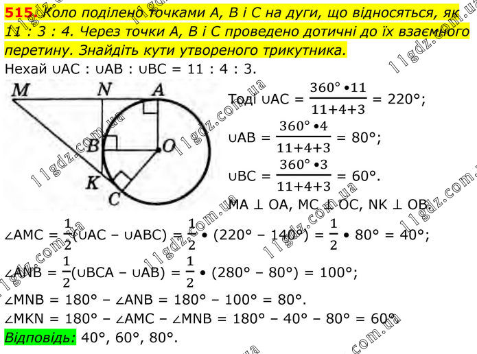 515. Коло поділено точками А, В і C на дуги, що відносяться, як 11 : 3 : 4. Через точки А, В і C проведено дотичні до їх взаємного перетину. Знайдіть кути утвореного трикутника. Нехай ∪AC : ∪AB : ∪BC = 11 : 4 : 3. Тоді ∪АС = (360° •11)/(11+4+3) = 220°; ∪АВ = (360° •4)/(11+4+3) = 80°; ∪BC = (360° •3)/(11+4+3) = 60°. МA ⊥ ОА, MC ⊥ ОС, NK ⊥ OB. ∠AMC = 1/2(∪АС – ∪ABC) = 1/2 • (220° – 140°) = 1/2 • 80° = 40°; ∠ANB = 1/2(∪ВСА – ∪AB) = 1/2 • (280° – 80°) = 100°; ∠MNB = 180° – ∠ANB = 180° – 100° = 80°. ∠MKN = 180° – ∠AMC – ∠MNB = 180° – 40° – 80° = 60°. Відповідь: 40°, 60°, 80°.