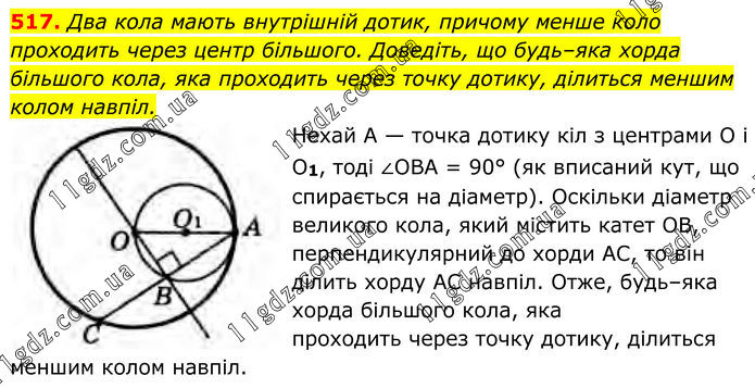 517. Два кола мають внутрішній дотик, причому менше коло проходить через центр більшого. Доведіть, що будь–яка хорда більшого кола, яка проходить через точку дотику, ділиться меншим колом навпіл. Нехай А — точка дотику кіл з центрами О і О1, тоді ∠OBA = 90° (як вписаний кут, що спирається на діаметр). Оскільки діаметр великого кола, який містить катет OB, перпендикулярний до хорди АС, то він ділить хорду АС навпіл. Отже, будь–яка хорда більшого кола, яка проходить через точку дотику, ділиться меншим колом навпіл.