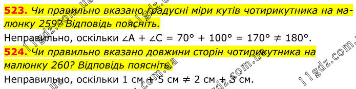 523. Чи правильно вказано градусні міри кутів чотирикутника на малюнку 259? Відповідь поясніть. Неправильно, оскільки ∠A + ∠C = 70° + 100° = 170° ≠ 180°. 524. Чи правильно вказано довжини сторін чотирикутника на малюнку 260? Відповідь поясніть. Неправильно, оскільки 1 см + 5 см ≠ 2 см + З см.