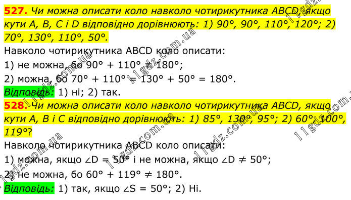 527. Чи можна описати коло навколо чотирикутника ABCD, якщо кути А, В, C і D відповідно дорівнюють: 1) 90°, 90°, 110°, 120°; 2) 70°, 130°, 110°, 50°. Навколо чотирикутника ABCD коло описати: 1) не можна, бо 90° + 110° ≠ 180°; 2) можна, бо 70° + 110° = 130° + 50° = 180°. Відповідь: 1) ні; 2) так. 528. Чи можна описати коло навколо чотирикутника ABCD, якщо кути A, B i C відповідно дорівнюють: 1) 85°, 130°, 95°; 2) 60°, 100°, 119°? Навколо чотирикутника ABCD коло описати: 1) можна, якщо ∠D = 50° і не можна, якщо ∠D ≠ 50°; 2) не можна, бо 60° + 119° ≠ 180°. Відповідь: 1) так, якщо ∠S = 50°; 2) Hi.