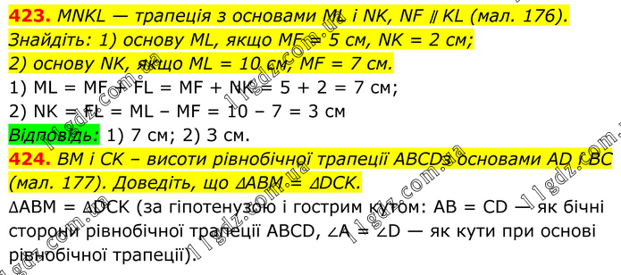 423. MNKL — трапеція з основами ML і NK, NF ∥ KL (мал. 176). Знайдіть: 1) основу ML, якщо MF = 5 см, NK = 2 см; 2) основу NK, якщо ML = 10 см, MF = 7 см. 1) ML = MF + FL = MF + NK = 5 + 2 = 7 cм; 2) NK = FL = ML – MF = 10 – 7 = 3 см Відповідь: 1) 7 см; 2) З см. 424. BM і CK – висоти рівнобічної трапеції ABCDз основами AD і BС (мал. 177). Доведіть, що ∆ABM = ∆DCK. ∆АВМ = ∆DCK (за гіпотенузою і гострим кутом: AB = CD — як бічні сторони рівнобічної трапеції ABCD, ∠A = ∠D — як кути при основі рівнобічної трапеції).