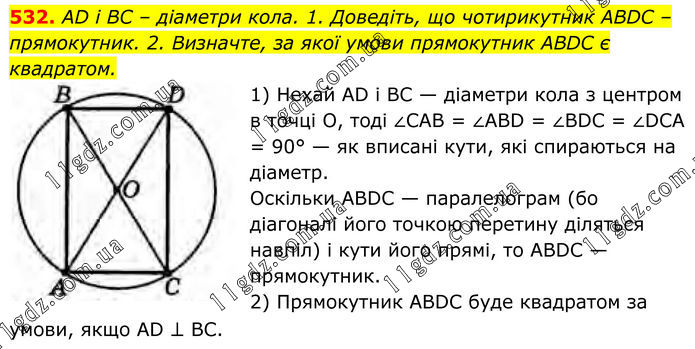 532. AD і BC – діаметри кола. 1. Доведіть, що чотирикутник ABDC – прямокутник. 2. Визначте, за якої умови прямокутник ABDC є квадратом. 1) Нехай AD і ВС — діаметри кола з центром в точці О, тоді ∠CAB = ∠ABD = ∠BDC = ∠DСА = 90° — як вписані кути, які спираються на діаметр. Оскільки ABDC — паралелограм (бо діагоналі його точкою перетину діляться навпіл) і кути його прямі, тo ABDC — прямокутник. 2) Прямокутник ABDC буде квадратом за умови, якщо AD ⊥ ВС.
