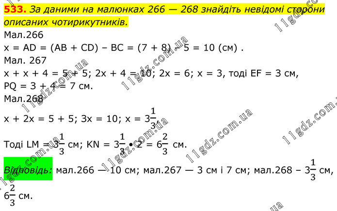 533. За даними на малюнках 266 — 268 знайдіть невідомі сторони описаних чотирикутників. Мал.266 x = AD = (AB + CD) – BC = (7 + 8) – 5 = 10 (cм) . Мал. 267 х + x + 4 = 5 + 5; 2x + 4 = 10; 2х = 6; x = 3, тоді EF = З см, PQ = З + 4 = 7 см. Мал.268 х + 2х = 5 + 5; Зх = 10; х = 31/3, Тоді LM = 31/3 см; KN = 31/3 • 2 = 62/3 см. Відповідь: мал.266 — 10 см; мал.267 — 3 см і 7 см; мал.268 – 31/3 см, 62/3 см.