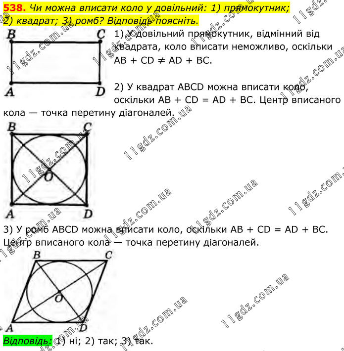 538. Чи можна вписати коло у довільний: 1) прямокутник; 2) квадрат; 3) ромб? Відповідь поясніть. 1) У довільний прямокутник, відмінний від квадрата, коло вписати неможливо, оскільки AB + CD ≠ АD + ВС. 2) У квадрат ABCD можна вписати коло, оскільки AB + CD = AD + ВС. Центр вписаного кола — точка перетину діагоналей. 3) У ромб ABCD можна вписати коло, оскільки AB + CD = AD + ВС. Центр вписаного кола — точка перетину діагоналей. Відповідь: 1) ні; 2) так; 3) так.