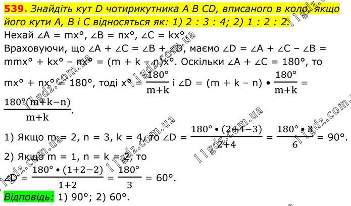 539. Знайдіть кут D чотирикутника A B CD, вписаного в коло, якщо його кути А, В і С відносяться як: 1) 2 : 3 : 4; 2) 1 : 2 : 2. Нехай ∠A = mx°, ∠B = nх°, ∠C = kx°. Враховуючи, що ∠A + ∠C = ∠B + ∠D, маємо ∠D = ∠A + ∠C – ∠B = mmх° + kx° – nх° = (m + k – n)х°. Оскільки ∠A + ∠C = 180°, то mx° + nx° = 180°, тоді х° = (180°)/(m+k) і ∠D = (m + k – n) • (180°)/(m+k) = (180°(m+k-n))/(m+k). 1) Якщо m = 2, n = 3, k = 4, то ∠D = (180° • (2+4-3))/(2+4) = (180° • 3)/6 = 90°. 2) Якщо m = 1, n = k = 2, то ∠D = (180° • (1+2-2))/(1+2) = (180° )/3 = 60°. Відповідь: 1) 90°; 2) 60°.