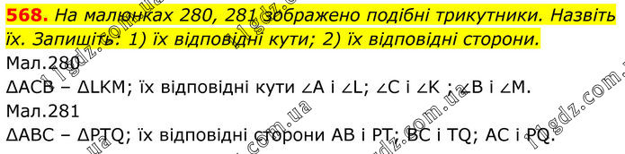 568. На малюнках 280, 281 зображено подібні трикутники. Назвіть їх. Запишіть: 1) їх відповідні кути; 2) їх відповідні сторони. Мал.280 ∆АСВ – ∆LKM; їх відповідні кути ∠A і ∠L; ∠C і ∠K ; ∠B і ∠M. Мал.281 ∆АВС – ∆PTQ; їх відповідні сторони AВ і РТ; BC i TQ; AC i PQ.