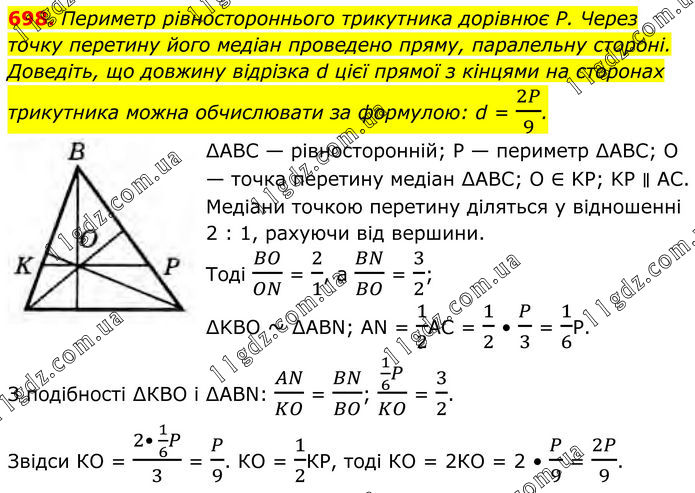 698. Периметр рівностороннього трикутника дорівнює Р. Через точку перетину його медіан проведено пряму, паралельну стороні. Доведіть, що довжину відрізка d цієї прямої з кінцями на сторонах трикутника можна обчислювати за формулою: d = 2P/9. ∆АВС — рівносторонній; Р — периметр ∆АВС; О — точка перетину медіан ∆АВС; О ∈ KP; KP ∥ АС. Медіани точкою перетину діляться у відношенні 2 : 1, рахуючи від вершини. Тоді BO/ON = 2/1, а BN/BO = 3/2; ∆KBO ~ ∆ABN; AN = 1/2АС = 1/2 • P/3 = 1/6Р. З подібності ∆КВО і ∆ABN: AN/KO = BN/BO; (1/6 P)/KO = 3/2. Звідси КО = (2• 1/6 P)/3 = P/9. КО = 1/2КР, тоді КО = 2КО = 2 • P/9 = 2P/9.