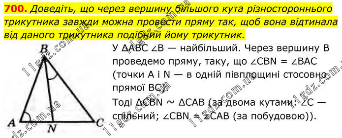 700. Доведіть, що через вершину більшого кута різностороннього трикутника завжди можна провести пряму так, щоб вона відтинала від даного трикутника подібний йому трикутник. У ∆АВС ∠В — найбільший. Через вершину В проведемо пряму, таку, що ∠CBN = ∠ВAC (точки А i N — в одній півплощині стосовно прямої ВС). Тоді ∆CBN ~ ∆САВ (за двома кутами: ∠C — спільний; ∠CBN = ∠CAB (за побудовою)).