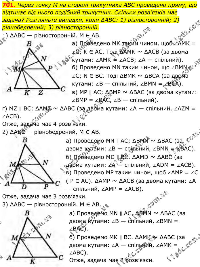 701. Через точку M на стороні трикутника ABC проведено пряму, що відтинає від нього подібний трикутник. Скільки розв’язків має задача? Розгляньте випадки, коли ∆АВС: 1) різносторонній; 2) рівнобедрений; 3) рівносторонній. 1) ∆АВС — різносторонній. М ∈ AB. а) Проведемо МК таким чином, щоб ∠AMК = ∠С; К ∈ АС. Тоді ∆АМК ~ ∆АСВ (за двома кутами: ∠AMK = ∠ACB; ∠A — спільний). б) Проведемо MN таким чином, що ∠BMN = ∠C; N ∈ ВС. Тоді ∆ВМК ~ ∆ВСА (за двома кутами: ∠B — спільний, ∠BMN = ∠BCA). в) МР ∥ АС; ∆ВМР ~ ∆BAC (за двома кутами: ∠BMP = ∠BAC, ∠B — спільний). г) MZ ∥ ВС; ∆AMZ ~ ∆АВС (за двома кутами: ∠A — спільний, ∠AZM = ∠ACB). Отже, задача має 4 розв’язки. 2) ∆АВС — рівнобедрений, М ∈ AB. а) Проведемо MN ∥ АС; ∆BMN ~ ∆BAC (за двома кутами: ∠B — спільний, ∠BMN = ∠BAC). б) Проведемо MD ∥ ВС. ∆AMD ~ ∆АВС (за двома кутами: ∠A — спільний, ∠ADM = ∠ACB). в) Проведемо МР таким чином, щоб ∠AMP = ∠C ( P ∈ АС). ∆АМР ~ ∆АСВ (за двома кутами: ∠A — спільний, ∠AMP = ∠ACB). Отже, задача має З розв’язки. 3) ∆АВС — рівносторонній. М ∈ AB. а) Проведемо MN ∥ AC. ∆BMN ~ ∆BAC (за двома кутами: ∠B — спільний, ∠BMN = ∠BAC). б) Проведемо МК ∥ ВС. ∆АМК ~ ∆AВС (за двома кутами: ∠A — спільний, ∠AMK = ∠ABC). Отже, задача має 2 розв’язки.