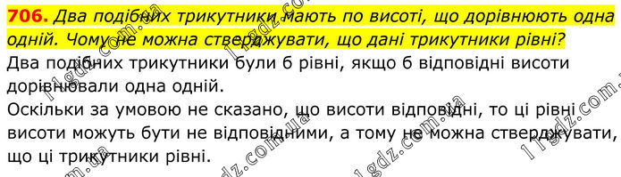 706. Два подібних трикутники мають по висоті, що дорівнюють одна одній. Чому не можна стверджувати, що дані трикутники рівні? Два подібних трикутники були б рівні, якщо б відповідні висоти дорівнювали одна одній. Оскільки за умовою не сказано, що висоти відповідні, то ці рівні висоти можуть бути не відповідними, а тому не можна стверджувати, що ці трикутники рівні.