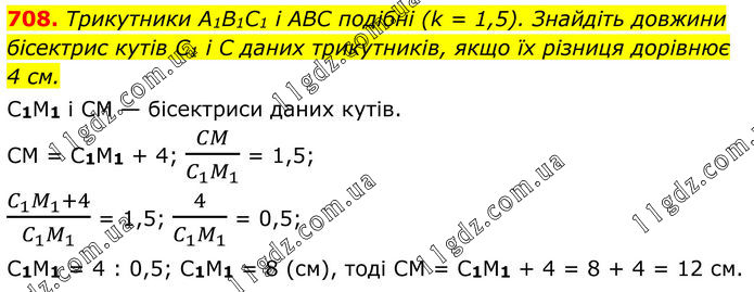 708. Трикутники A1B1C1 і ABC подібні (k = 1,5). Знайдіть довжини бісектрис кутів C1 і C даних трикутників, якщо їх різниця дорівнює 4 см. С1М1 і CM — бісектриси даних кутів. СМ = С1М1 + 4; CM/(C_1 M_1 ) = 1,5; (C_1 M_1+4)/(C_1 M_1 ) = 1,5; 4/(C_1 M_1 ) = 0,5; С1М1 = 4 : 0,5; С1М1 = 8 (см), тоді CM = С1М1 + 4 = 8 + 4 = 12 см.