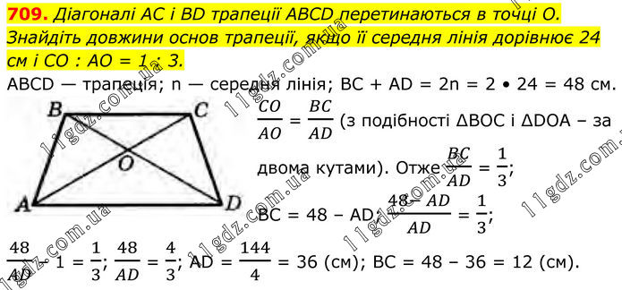 709. Діагоналі AC i BD трапеції ABCD перетинаються в точці О. Знайдіть довжини основ трапеції, якщо її середня лінія дорівнює 24 см і CO : AO = 1 : 3. ABCD — трапеція; n — середня лінія; ВС + AD = 2n = 2 • 24 = 48 см. CO/AO = BC/AD (з подібності ∆BOC і ∆DOA – за двома кутами). Отже BC/AD = 1/3; ВС = 48 – AD; (48- AD)/AD = 1/3; 48/AD – 1 = 1/3; 48/AD = 4/3; AD = 144/4 = 36 (см); ВС = 48 – 36 = 12 (см)