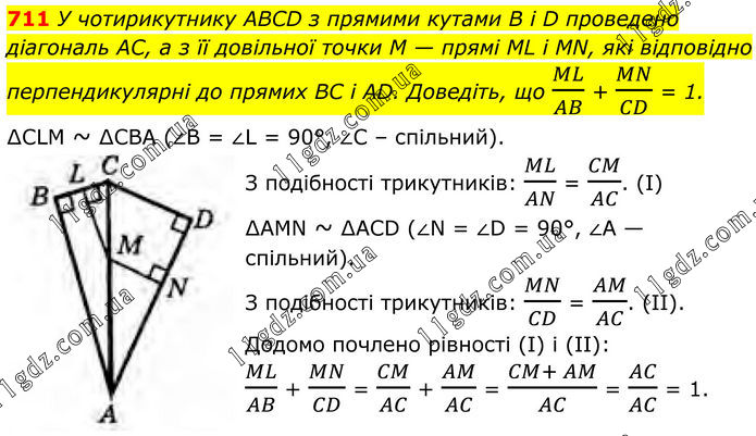 711 У чотирикутнику ABCD з прямими кутами B і D проведено діагональ AC, а з її довільної точки M — прямі ML і MN, які відповідно перпендикулярні до прямих BC і AD. Доведіть, що ML/AB + MN/CD = 1. ∆CLM ~ ∆CBA (∠B = ∠L = 90°, ∠C – спільний). З подібності трикутників: ML/AN = CM/AC. (І) ∆AMN ~ ∆ACD (∠N = ∠D = 90°, ∠A — спільний). З подібності трикутників: MN/CD = AM/AC. (II). Додомо почлено рівності (І) і (II): ML/AB + MN/CD = CM/AC + AM/AC = (CM+ AM)/AC = AC/AC = 1.