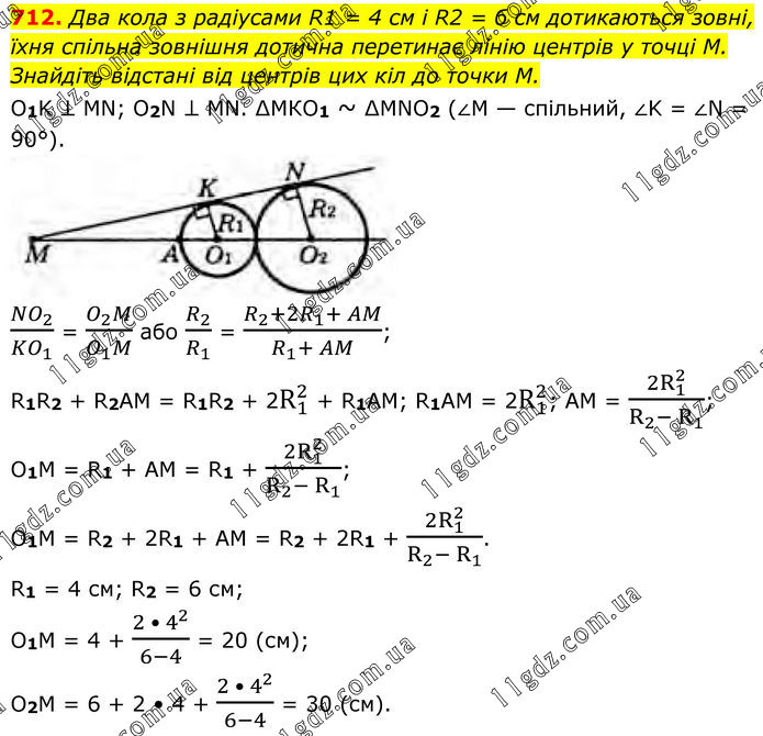 712. Два кола з радіусами R1 = 4 см і R2 = б см дотикаються зовні, їхня спільна зовнішня дотична перетинає лінію центрів у точці М. Знайдіть відстані від центрів цих кіл до точки М. O1K ⊥ MN; O2N ⊥ MN. ∆МКО1 ~ ∆MNO2 (∠M — спільний, ∠K = ∠N = 90°). 〖NO〗_2/〖KO〗_1 = (O_2 M)/(O_1 M) або R_2/R_1 = (R_2+2R_1+ AM)/(R_1+ AM); R1R2 + R2AM = R1R2 + 2R_1^2 + R1AM; R1AM = 2R_1^2; AM = (2R_1^2)/(R_2- R_1 ); O1M = R1 + AM = R1 + (2R_1^2)/(R_2- R_1 ); O1M = R2 + 2R1 + AM = R2 + 2R1 + (2R_1^2)/(R_2- R_1 ). R1 = 4 см; R2 = 6 см; О1М = 4 + 〖2 • 4〗^2/(6-4) = 20 (см); О2М = 6 + 2 • 4 + 〖2 • 4〗^2/(6-4) = 30 (см).
